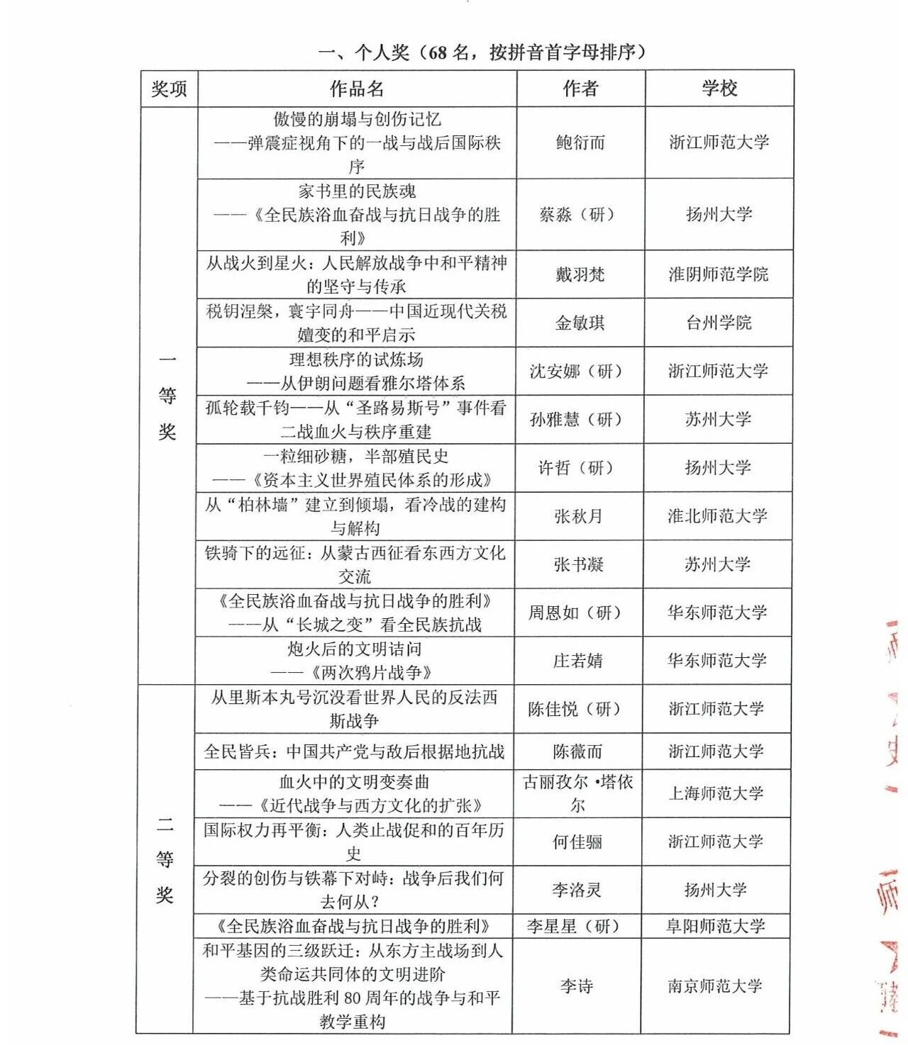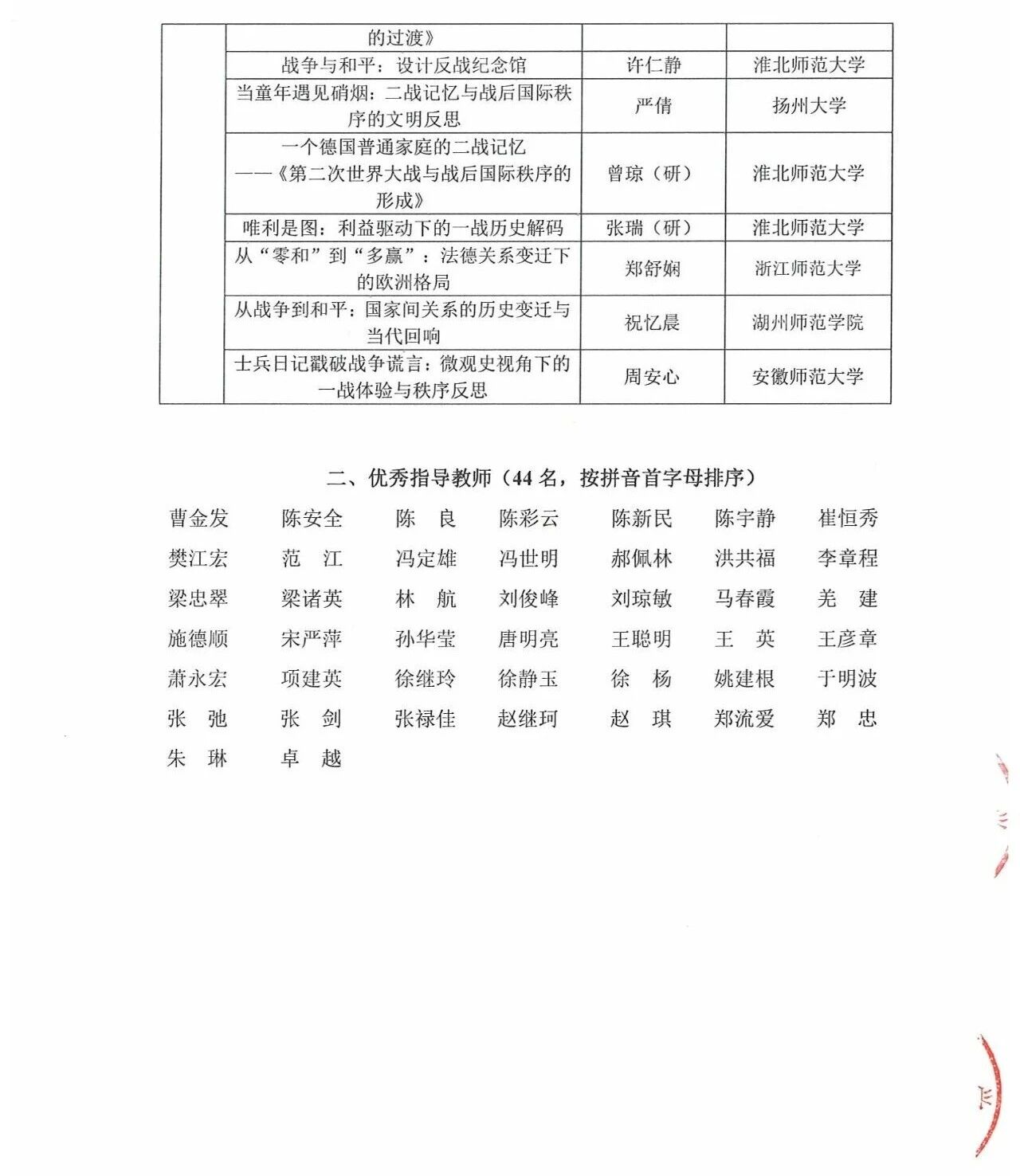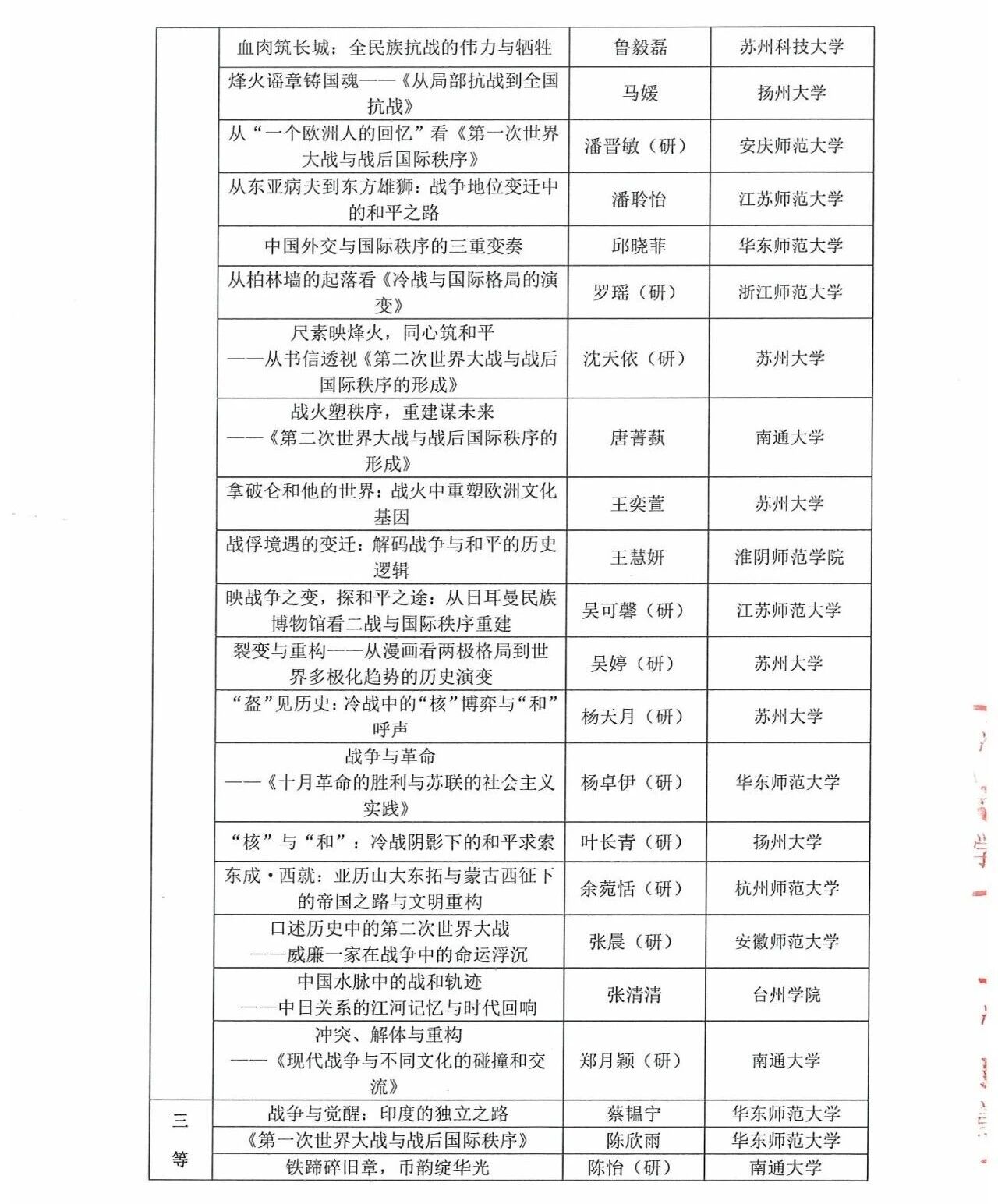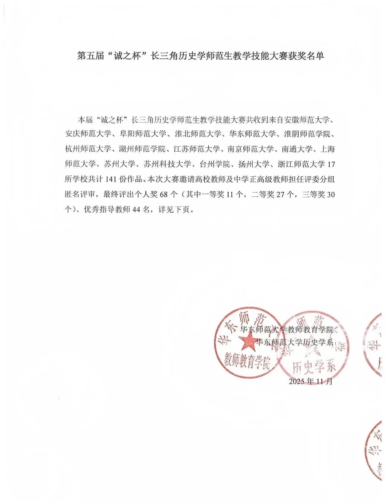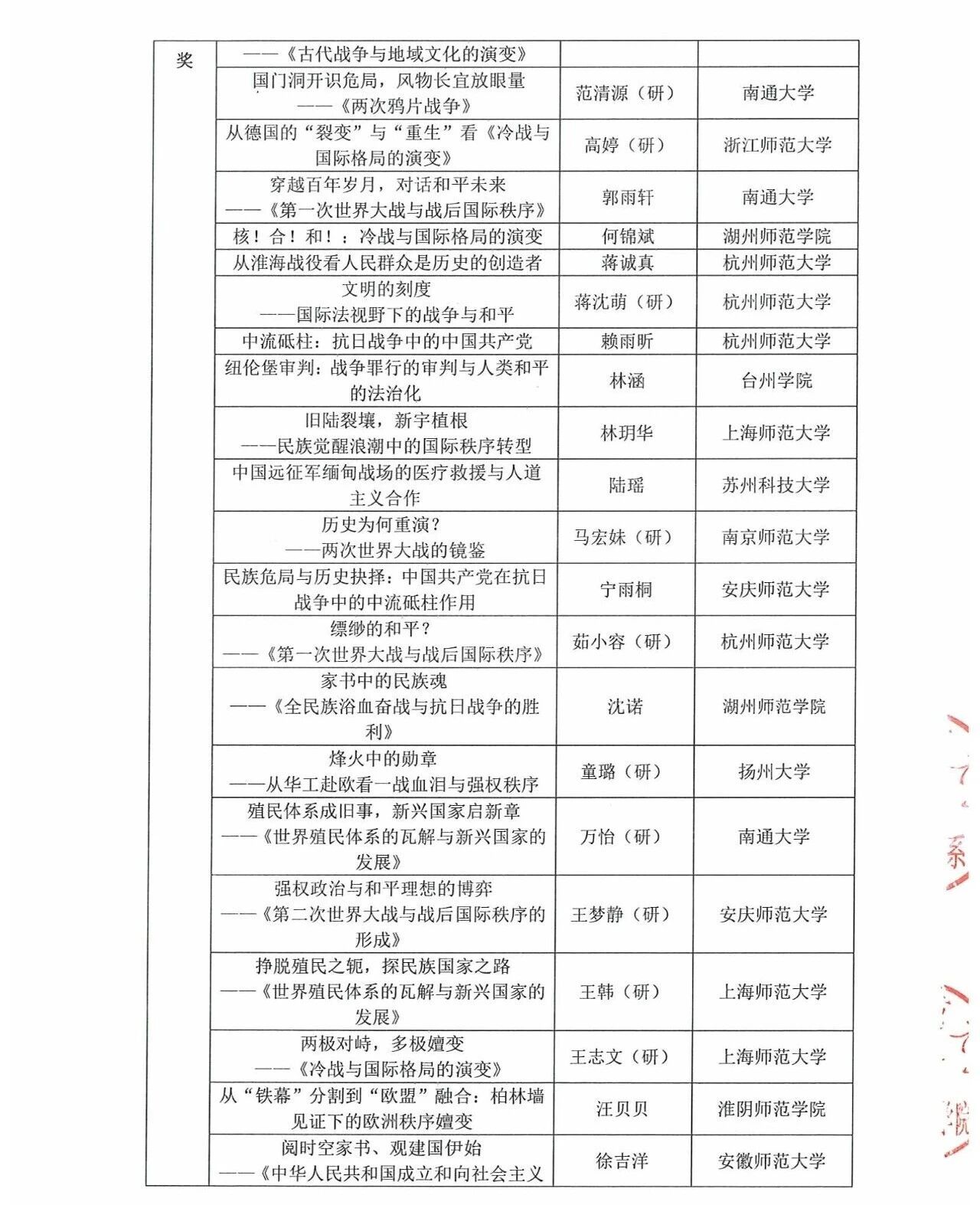 第五届“诚之杯”长三角历史学师范生教学技能大赛获奖名单