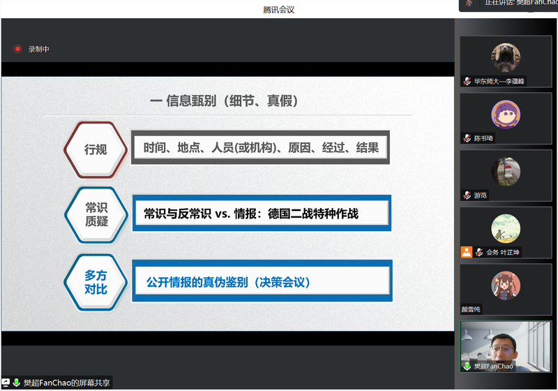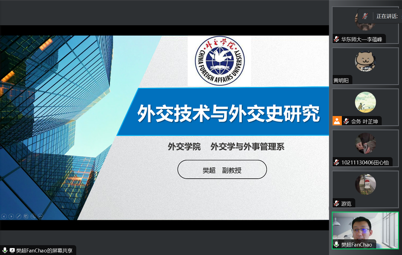 2023年8月11日至12日,华东师范大学“史海新舟”跨学科讲堂第五季邀请到外交学院外交学与外事管理系副教授樊超老师,进行“外交技术与外交史研究”专题课程的讲授。华东师范大学历史学系副教授、“思勉班”导师游览老师主持此次学术活动。本系列课程受到广泛关注,活动通过腾讯会议直播进行,来自华东师范大学、武汉大学等高校的师生参与本次活动。