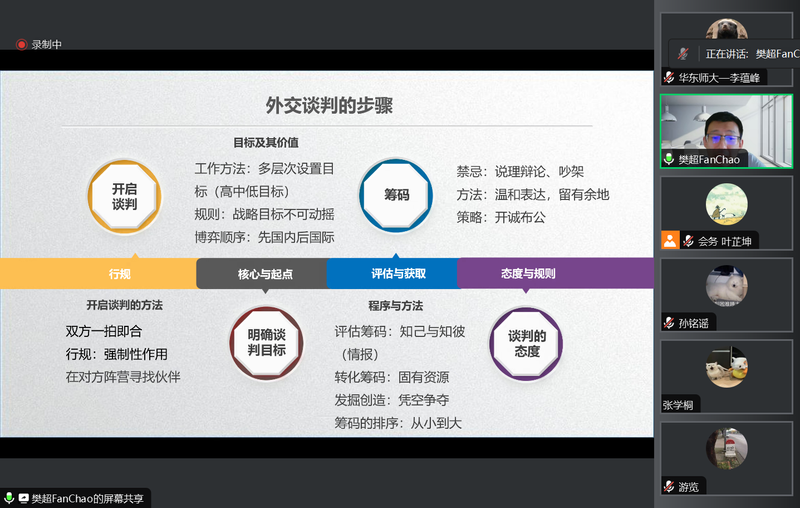 在第三讲“外交谈判技巧”,樊超老师从广义和狭义两个维度为同学们介绍了外交谈判的定义,提出外交谈判有别于商务谈判,以信誉与长期效果作为基本原则,不能使用诡诈手段。此外,樊超老师结合多个外交案例,从如何开启谈判、明确谈判目标、评估筹码、谈判中的规则与禁忌、施加压力以及切分议题等几个方面展开讲述,阐释外交谈判的具体步骤及相关方面的技巧。本讲最后,樊老师就外交谈判周期长、内容多等特征,建议大家在研读相关档案时应有耐心、从细节中发掘出新的视角。