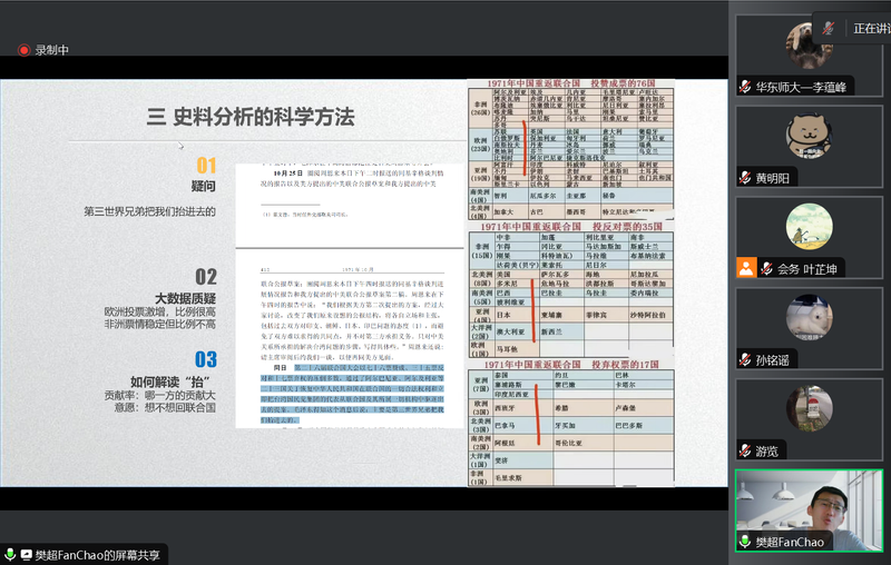 最后,樊超老师向师生讲授外交史研究的技术路径,列举可用的史料种类、选用原则及史料分析的科学方法。同时,研究者需要具备足够的认知能力和审慎的治学态度。樊老师最后以钱其琛《外交十记》为例,明了谨慎辨析、运用材料的重要性。