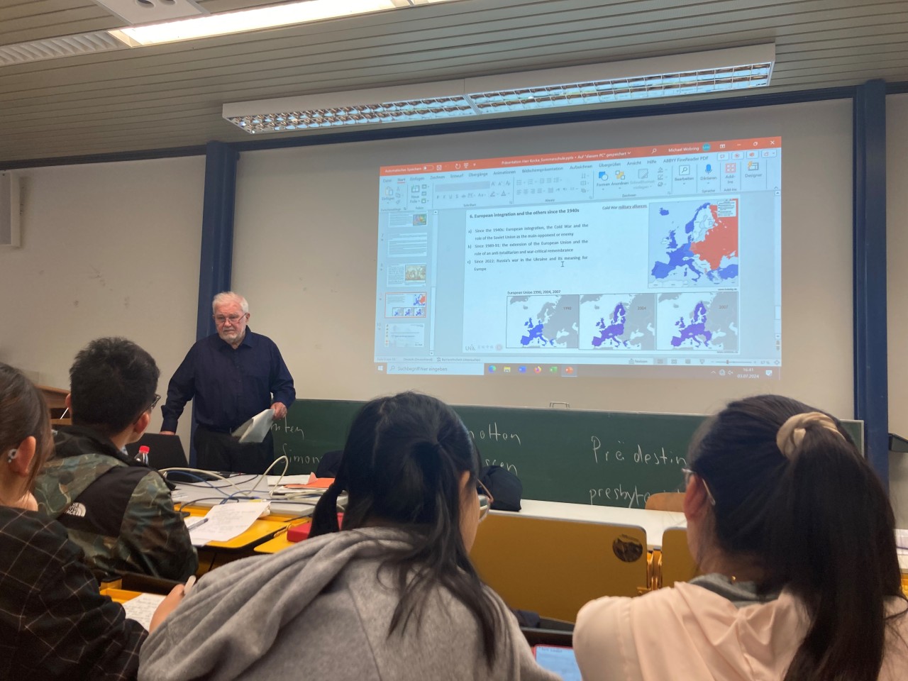 下午,景德祥开设“中国人德国观念的历史发展”讲座,利用各种史料细致追溯了从晚清、民国到改革开放,中国人眼中德国形象的变迁,并且深入探讨了种种形象塑造背后的语境与诉求。德国著名历史学家、柏林自由大学终身教授、国际历史科学委员会前主席于尔根·科卡(Jürgen Kocka)开设“历史视角下的欧洲联系、冲突和认同”讲座,详细分析了欧洲身份认同的历史演变。一方面,欧洲人的身份主要是通过与他人的紧张关系和冲突产生的;但另一方面,欧洲也是通过与其他国家的合作和交流、学习和同化而形成的。通过欧洲联合实现欧洲和平的理念,始终是欧洲社会的一个重要主题。在讨论环节,学员们就欧洲的现状、欧洲人对中国的态度变化等问题展开交流。