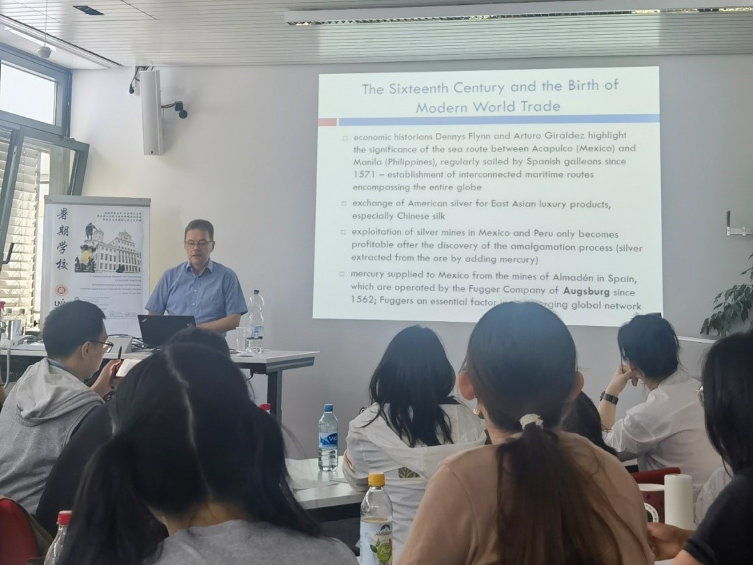 学员们在奥格斯堡大学参加了三场讲座。在第一场讲座“第三种世界史——《写给青少年的世界文明史》简介”中,东方出版中心的沈辰成编辑探讨了向青少年传播世界史的理论思考、出版实践、现实困难和其所在团队所采取的应对策略。第二场讲座由奥格斯堡大学斯博士蒂凡·鲍卢斯(Stefan Paulus)主讲“纳粹历史在德国历史文化中的意义”。鲍卢斯从联邦德国纪念文化中的纳粹历史、民主德国纪念文化中的纳粹历史和德国的纳粹史研究这三个方面切入,向学员们展示了纳粹历史对德国政治、社会和学术的深刻影响。第三场讲座由班贝格大学教授马克·哈伯莱茵(Mark Häberlein)主讲“奥格斯堡、施瓦本和外面的世界:近代早期的全球化与区域”。以富格尔贸易公司和韦尔泽贸易公司为例,展示了奥格斯堡如何在17世纪和18世纪晚期同国际贸易网络建立全球联系。他指出这种联系还扩展到施瓦本地区的其他城市,最终不但促进了经济上的创新,而且也促使南德意志地区逐渐形成了一种“全球性意识”。