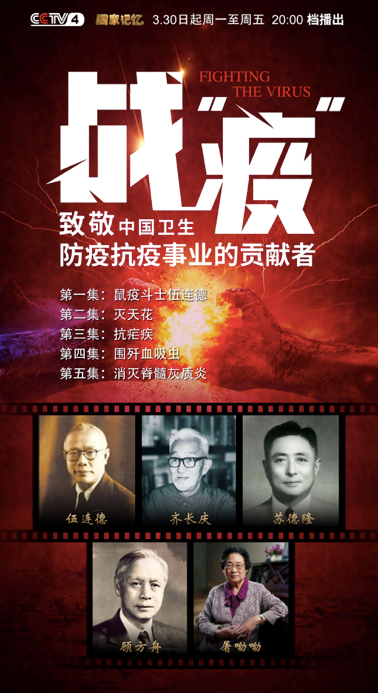 由中央广播电视总台华语环球节目中心摄制的五集纪录片《战“疫”》3月30日起在中央电视台中文国际频道(CCTV-4)晚8点档首播。在中国疾病预防控制中心学术支持下,该片全面回顾了鼠疫、天花、疟疾、血吸虫病、脊髓灰质炎这五种严重危害人类健康的疾病在中国的防治历程,展现伍连德、齐长庆、苏德隆、顾方舟、屠呦呦等在防控传染病过程的杰出贡献。全片分为《鼠疫斗士伍连德》《灭天花》《抗疟疾》《围歼血吸虫》《消灭脊髓灰质炎》五集,对我国防疫抗疫事业发生翻天覆地的发展变化进行了忠实记录,也对我国疾病治疗研究为世界作出的贡献进行了系统性总结。