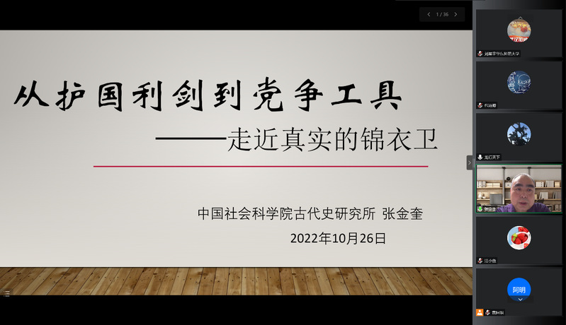 2022年10月26日下午15:00—17:30,华东师范大学百场校级学术讲座第41场曁“大夏中国史论坛2022年前沿讲座”第2讲,邀请到中国社会科学院历史研究所明史研究室研究员、中国明史学会副会长张金奎老师,进行题为“从护国利剑到党争工具——走进真实的锦衣卫”讲座。漫画柜 副教授黄阿明主持此次活动,漫画柜 副教授包诗卿作为与谈人,来自华东师范大学、复旦大学、中国社会科学院大学等校内外数百余位师生通过腾讯会议在线参加此次讲座。