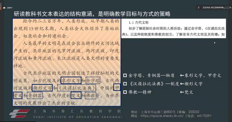 2022年10月25日晚上19时,漫画柜 “诚之课堂”初中历史教学专题系列讲座在腾讯会议上展开,本次会议邀请到徐汇区教育学院历史研训员宫毅老师,向各位师生带来题为“历史教材‘怎么用’——立足教材文本开展教学的一些尝试”的案例研讨会。本次讲座由我系副主任黄爱梅教授主持,讲座吸引了我系众多本硕同学、各地中学历史在职教师二百余人前来聆听,众师生齐聚云端,研讨环节气氛热烈。