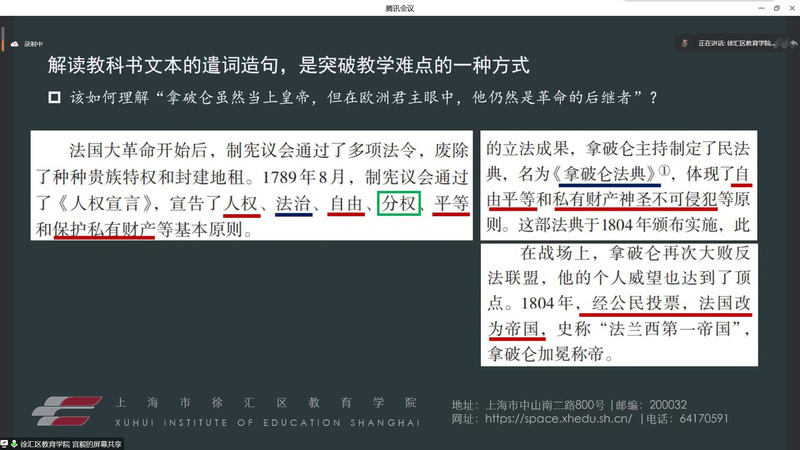 在第四部分,宫老师以“法国大革命”一课对拿破仑的评价为例,谈到学生可能对拿破仑的双重身份解读对产生困难,这时候应该回到教材文本,帮助学生理解这一概念。宫老师带领大家结合《人权宣言》与教材中关于《拿破仑法典》的文本表述,分析“人权”、“自由”、“法治”、“分权”等概念在《拿破仑法典》中的体现。接着,宫老师又以“宋元时期的都市文化”为例,谈到其难点在于如何描述宋代都市的繁荣程度,因此要通过解读经济现象来帮助学生理解。故宫老师通过一则描述了大相国寺售卖日用杂货和奢侈品的文本来帮助理解。通过“宋代经济的发展”和“清朝前期社会经济的发展”两课,宫老师提醒大家关注分析遣词造句,注意“发展”所体现的比较意味。