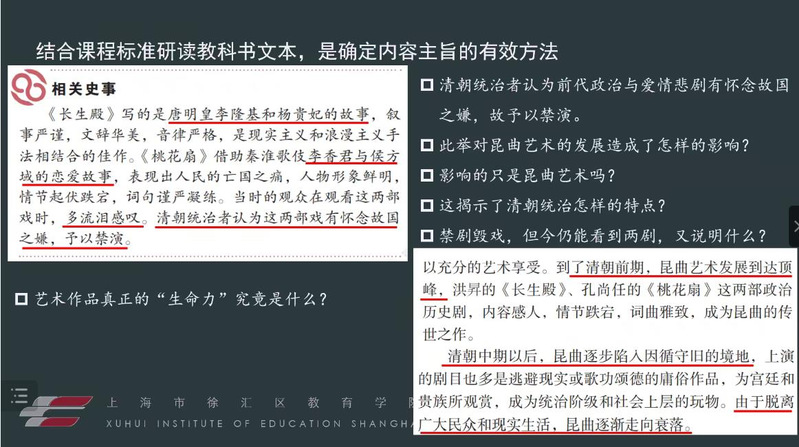宫老师以“清朝前期的文学艺术”一课为例,按照课程标准对于单元和整本教材的把握,应该借助清朝文学艺术作品的内容与其在传播、发展过程中的境遇,反窥清代君主专制高度集权体制下隐藏的社会危机,并从禁演政策下这类文学艺术作品至今仍然存在,引出关于文学艺术作品生命力的思考。之后,宫老师又以“马克思主义的诞生与传播”一课为例,帮助大家进一步理解,并提醒大家关注课程所在单元,应联系前后课程内容和单元导言,来确定课程的内容主旨与课程重点:这一课程设置在工业革命单元之后,课程标准也将工业革命与马克主义的诞生放在一个子目之中,因此应该从工业革命带来的社会矛盾入手去看待马克思主义的现实意义,而不是紧抓基本理论不放。