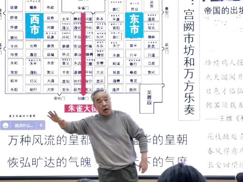 李老师以《从隋唐盛世到五代十国》为例告诉我们如何进行长时段、大视野的教学设计。李老师抛出问题:四十分钟的课堂如何承载数百年的隋唐史,灵感从何而来?长安是隋唐两代的国都,因此李老师以长安为缩影,反映那个波澜壮阔的时代。教材讲的是隋的建立与统一、唐如何取代隋、唐怎么衰落等历史过程,但是这样冷冰冰的文字,学生不愿意听,所以李老师将其改为:仁寿宫谜案、太极殿逼宫、玄武门之变、安禄山进京等富有诗意的语言。李老师以“宫阙市坊和万方奏乐”来凝练教材中的“盛世繁华”和“民族关系”两个要点。李老师还通过分析杜甫的诗句,来告诉我们如何进行以诗证史的教学设计,如何培养学生史料实证的核心素养。