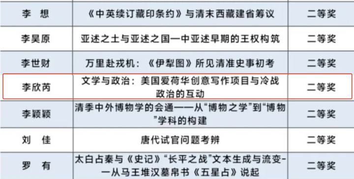 近日,第三届“励耘”全国历史学研究生论文竞赛评选结果揭晓,我系博士研究生李欣芮的论文《文学与政治:美国爱荷华创意写作项目与冷战政治的互动》获二等奖。