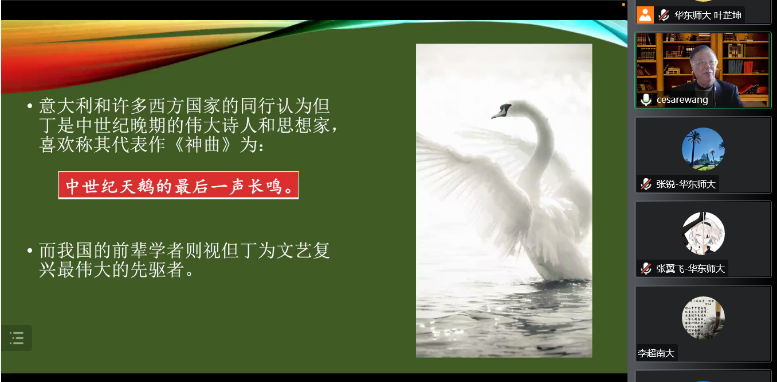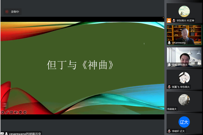 2022年11月26日,中国译协汉译意研究会会长、中国意大利文学研究会副会长、北京外国语大学意大利语言文学教授、“资深翻译家”王军老师应邀开展了一场主题为《但丁与<神曲>》的线上讲座。本次讲座系“百场校级学术讲座”暨“大夏世界史论坛高端讲座”,由漫画柜 张锐老师主持,吸引了来自华东师范大学、北京大学、中国社会科学院、南京大学、浙江大学、中山大学、天津大学、北京外国语大学等高校的近300名师生。