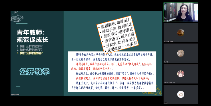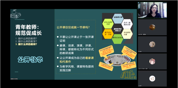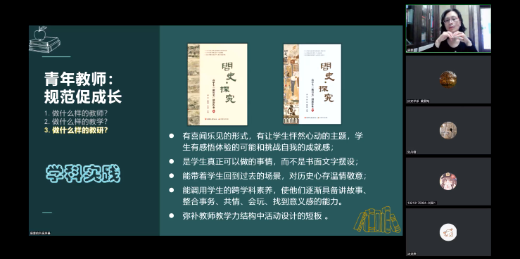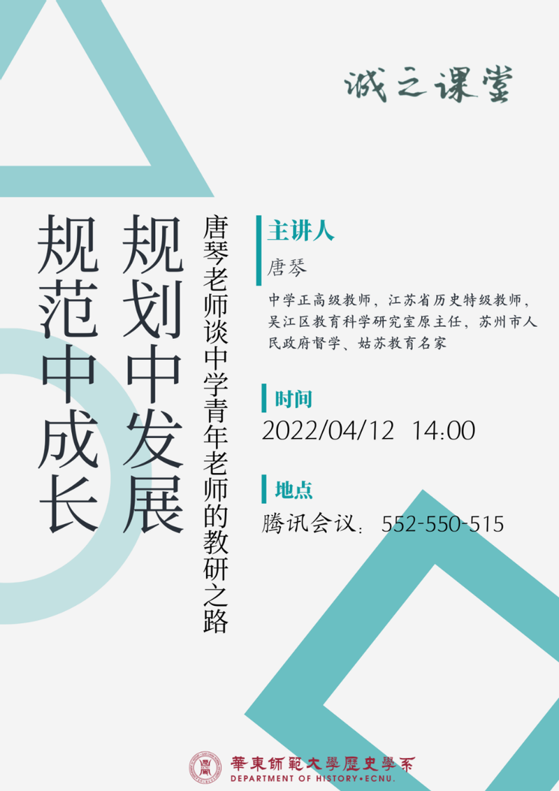对于尚未走上教学岗位的准教师们来说,对未来的成长道路有许多憧憬。2022年4月12日,我系邀请江苏省历史特级教师唐琴老师做了一场名为《规范中成长,规划中发展》的精彩讲座。唐老师结合个人在一线教学和行政工作中的经验,围绕中学青年教师的教研之路这一主题,在云端与我系学生和参会青年教师进行交流。
