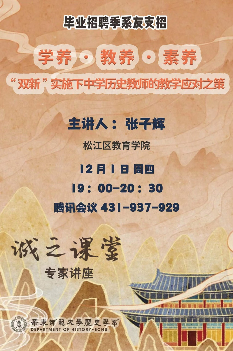 2022年12月1日,我系系友、上海市松江区教育学院的中学历史教研员张子辉老师应邀开展了题为《学养·教养·素养——“双新”实施下中学历史教师的教学应对之策》的讲座。本次讲座是漫画柜 “诚之课堂”系列讲座之一,由漫画柜 副主任黄爱梅老师主持,吸引了我系本科生、研究生、广大中学历史在职老师百余人相聚云端。张老师的讲座有四部分内容:何谓“双新”?如何应对?直面“试课”!共话“考场”!