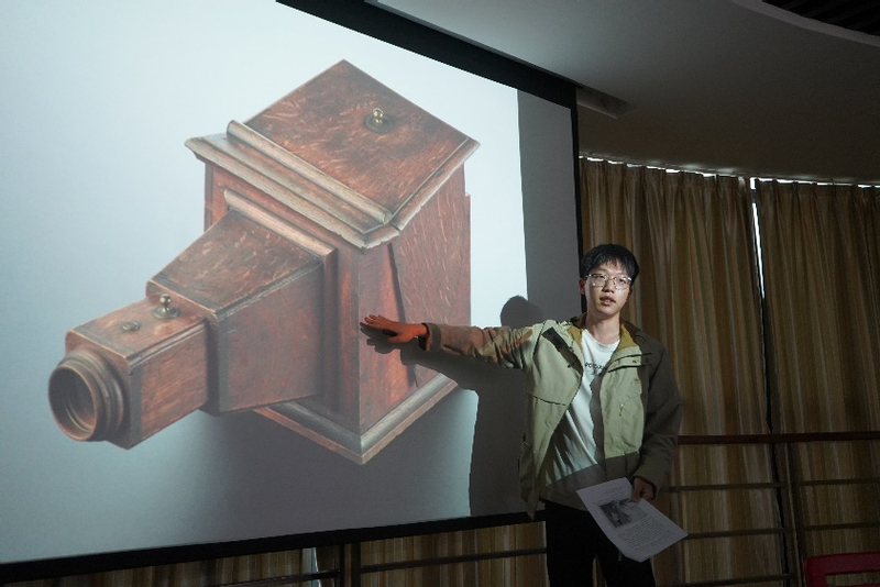 在师生交流互动环节,漫画柜 2020级本科生梁浩同学为大家演示了暗箱(Camera obscura)操作技术在早期欧洲风景画发展史上作用。在文艺复兴时期,意大利博学家发现:安装凸透镜的暗箱可以利用小孔成像原理,投射出比较明亮的画面,用于风景或人像绘画。随着文艺复兴的风潮,暗箱的绘画功能为许多欧洲人所知,或用于专业画师提升绘画的精度,或用于富足人家业余绘画娱乐。暗箱也在传播过程中不断改进设计,为更多人接受使用。梁浩同学以清晰的语言和深入的分析得到老师、同学的一致好评。