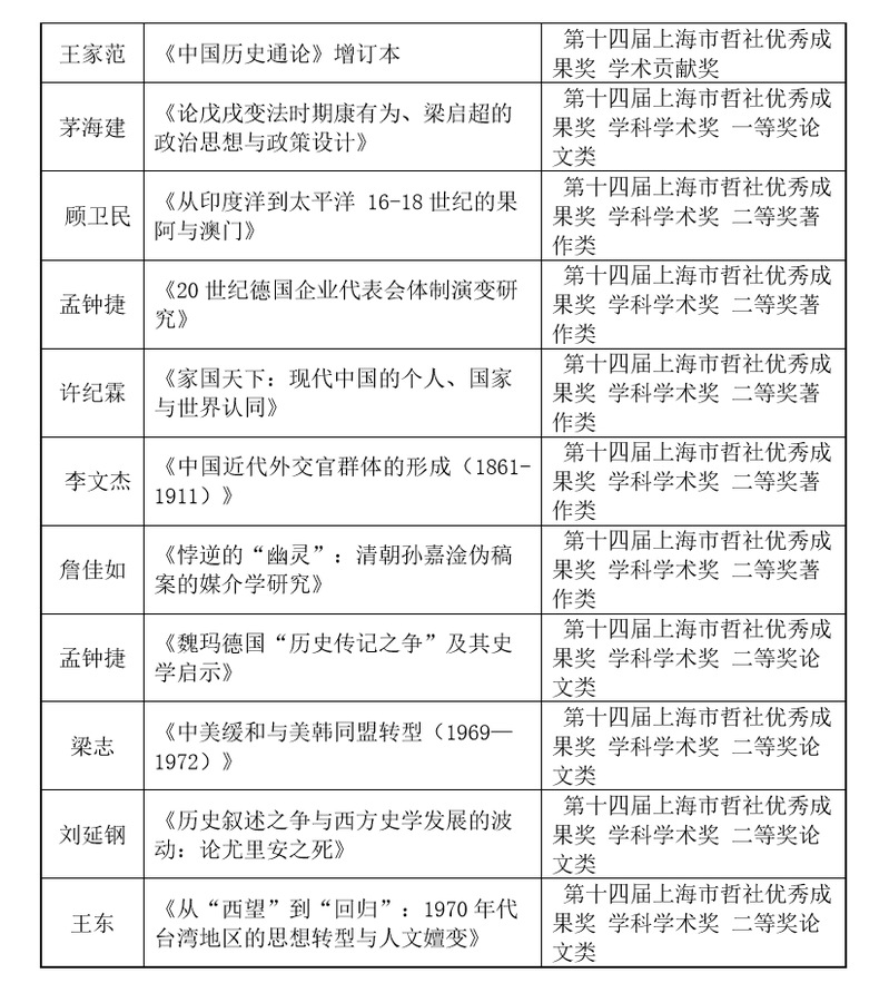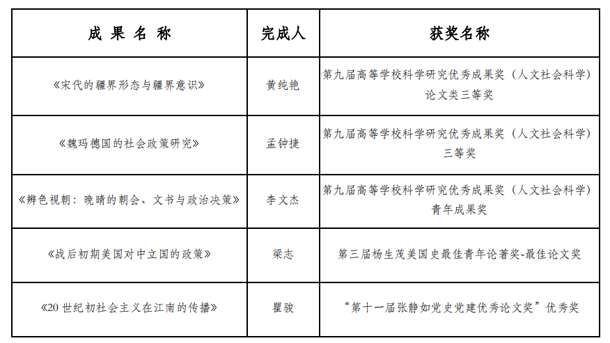 历史学系和社研院教师潜心耕耘,学术成果也获得了学界的认可,获得第九届高等学校社会研究优秀成果奖三项、杨生茂美国史最佳青年论著奖、张静如党史党建优秀论文奖。