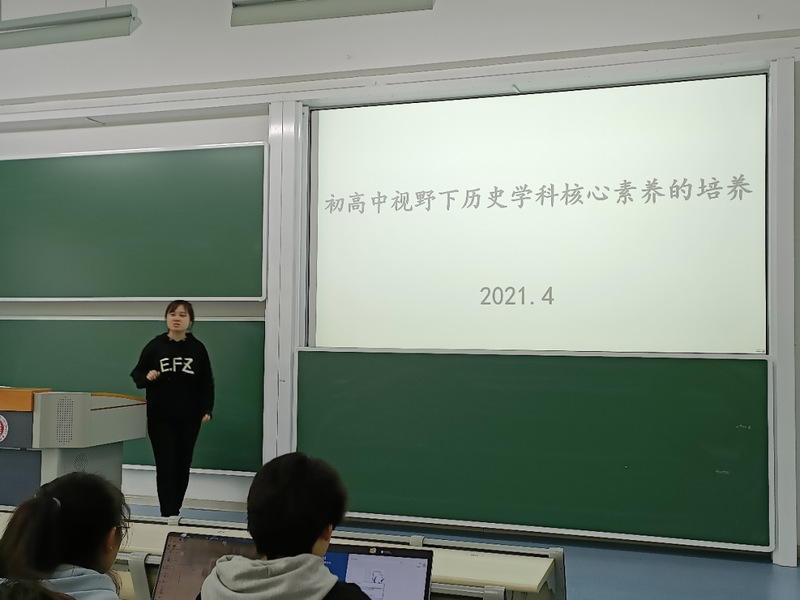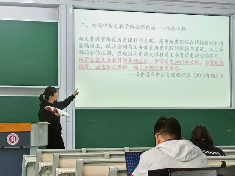 杨老师的讲座主要围绕“如何在初高中衔接过程中培养学生的核心素养”展开,共分:关于统编教材教学的建议、初高中历史教学衔接的内涵、初高中备课的共性与差异性三个部分。其中,杨老师重点讲解了初高中备课的共性与差异性这一部分。